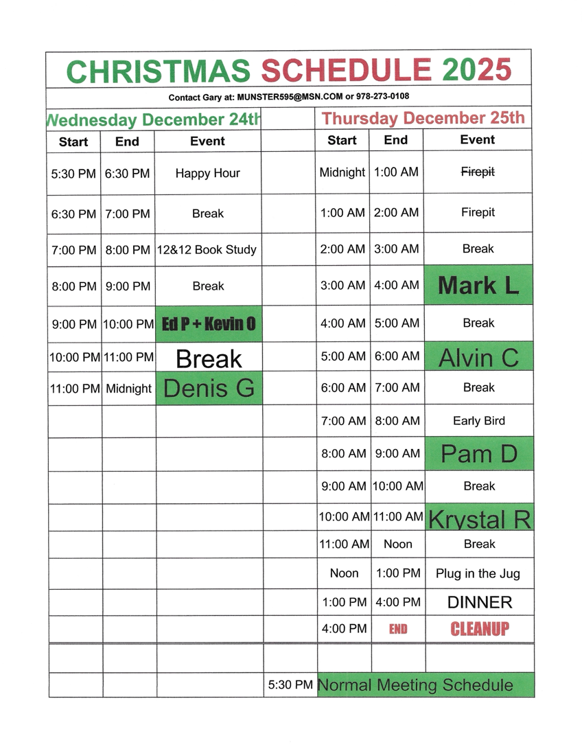 Begins - Wednesday, December 24, 2025 @ 5:30 PM Ends - Thursday, Christmas Day @ 4:00PM Meetings from 5:30PM night before Christmas all through the night until Christmas Day at 1PM. See Schedule • 2720 East Main St Lakeland, FL. • Christmas Dinner - From 1:00PM Until 4:00PM Christmas Day (all dishes and sides appreciated)...