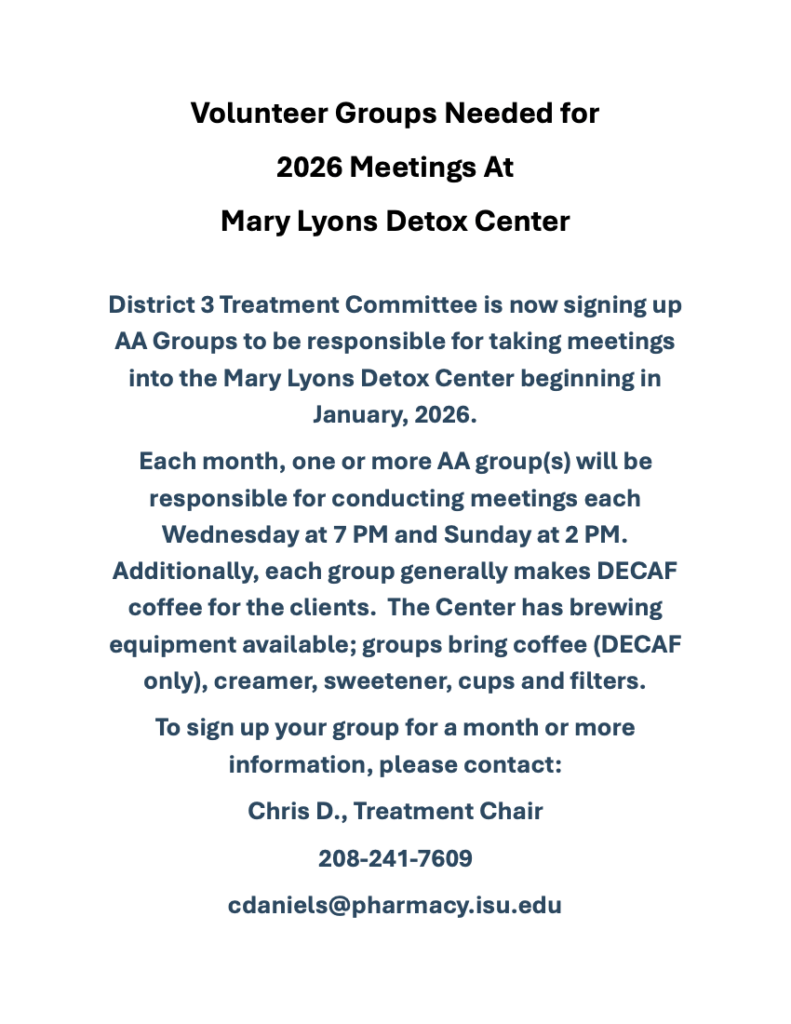District 3 Treatment Committee is now signing up AA Groups to be responsible for taking meetings into the Mary Lyons Detox Center beginning in January, 2026. Each month, one or...