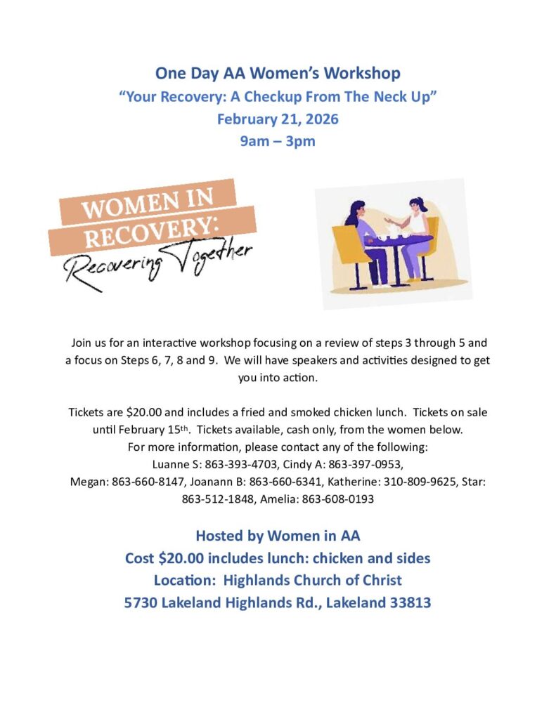 This is a one-day interactive Women's Conference/Workshop. It will feature a quick review of steps 3, 4 and 5 and hands-on work with steps 6, 7, 8 and 9. Lunch...