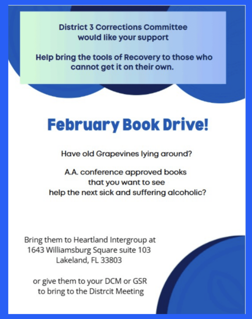 District 3 Corrections Committee would like your support Help bring the tools of Recovery to those who cannot get it on their own.Have old Grapevines lying around? A.A. conference approved...