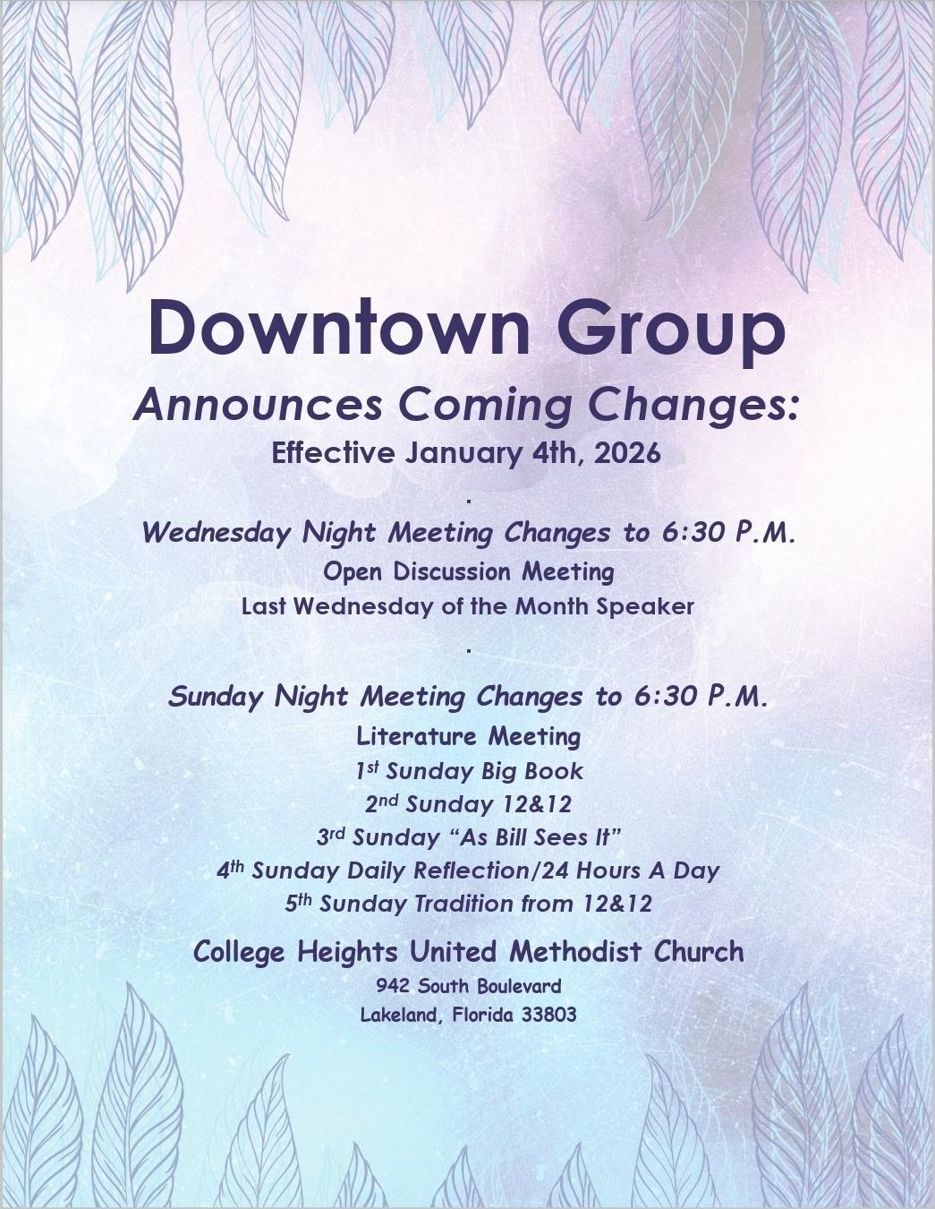 The Downtown Group of A.A is Moving. Beginning 12/03/2025 College Heights United Methodist Church 934 South Blvd., Lakeland, FL 33803 SUNDAY, 7:30PM: STEP STUDY WEDNESDAY, 7:30PM: BIG BOOK STUDY