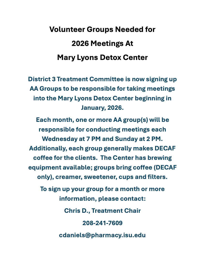 District 3 Treatment Committee is now signing up AA Groups to be responsible for taking meetings into the Mary Lyons Detox Center beginning in