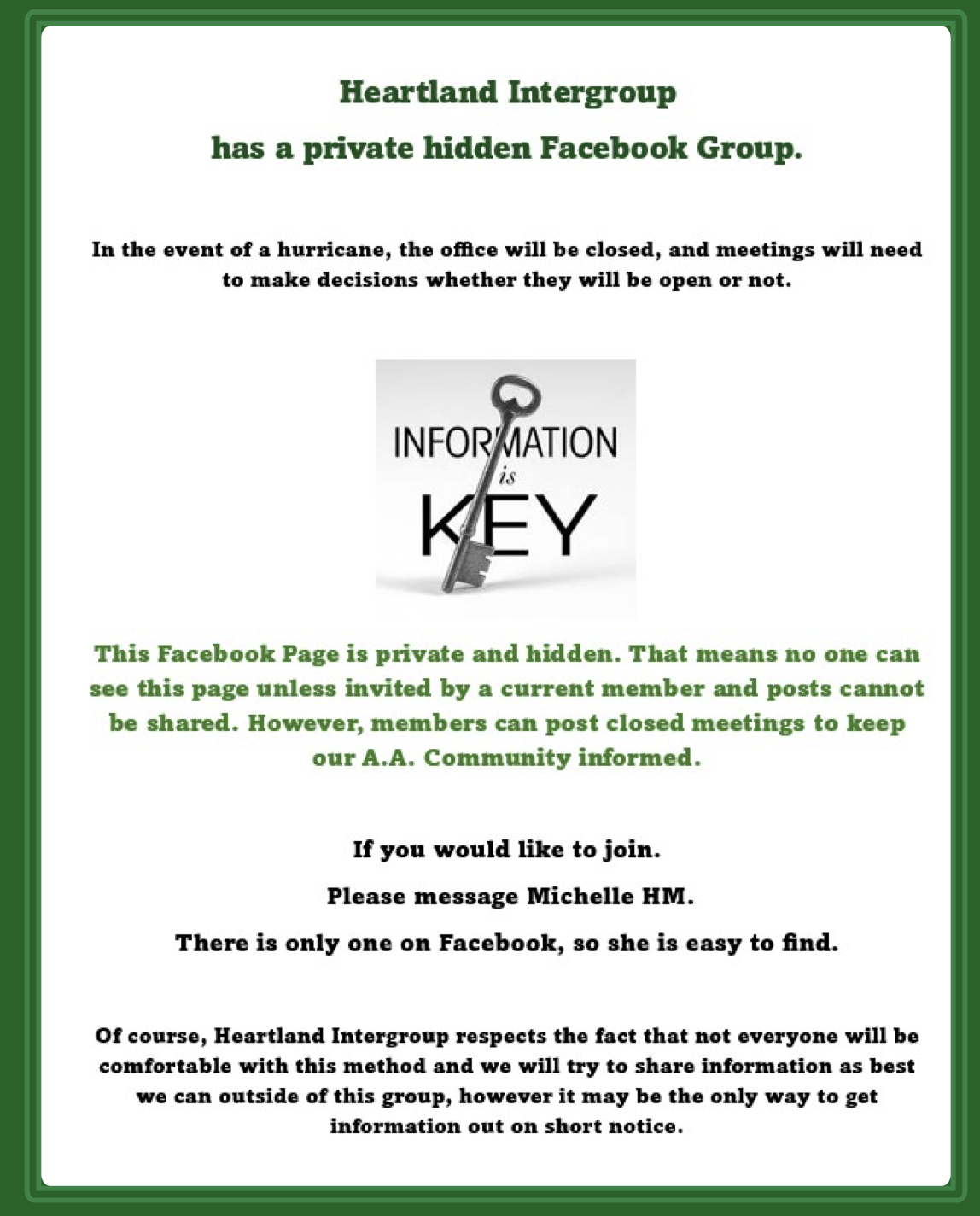 Heartland Intergroup invites you to update your meeting’s contact information on our website. Keeping this up to date helps us stay connected and ensures we can reach out with any questions or support your group may need.