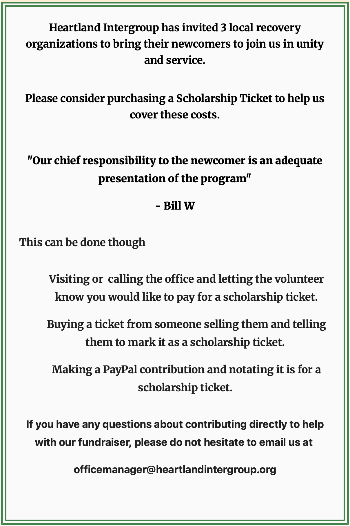 Heartland Intergroup has invited 3 local recovery organizations to bring their newcomers to join us in unity and service.